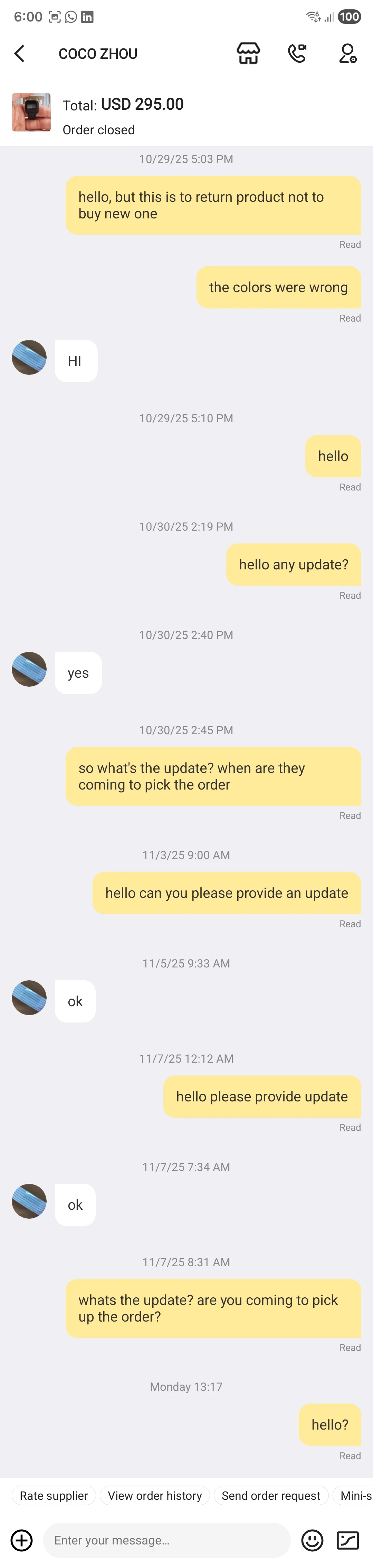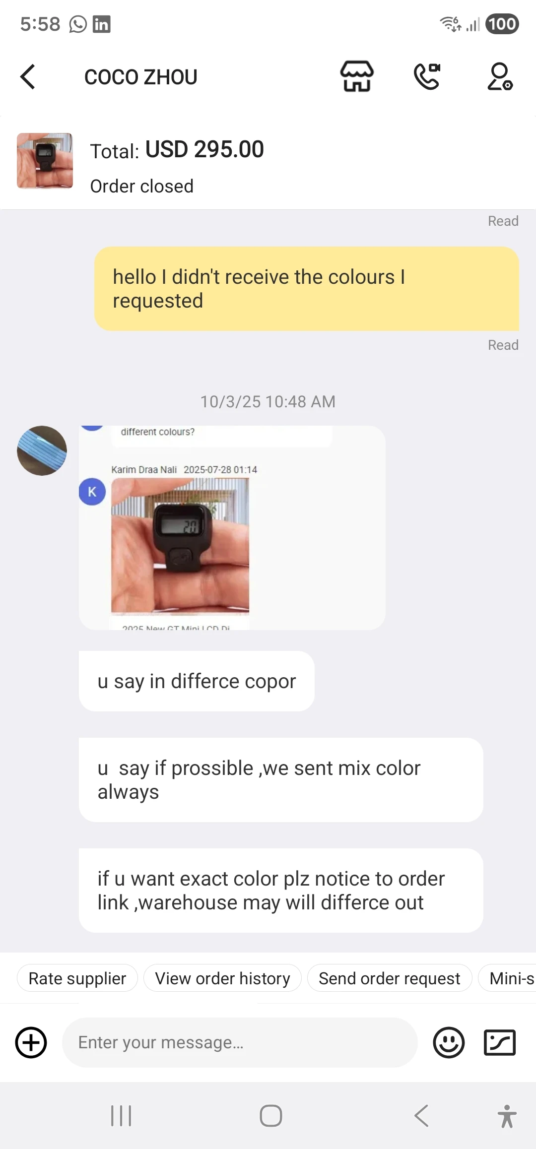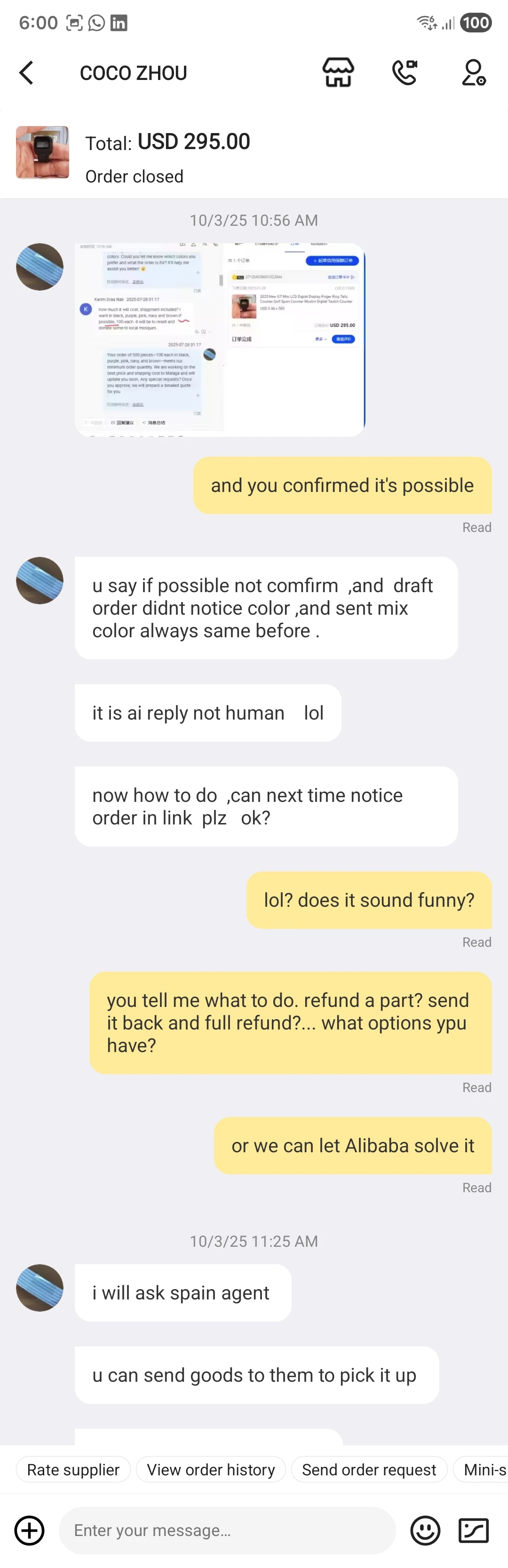 I waited a long time to write a review because I was giving a chance to the seller. I ordered 500 finger counters and requested 5 different colours, 100 each. After almost 3 months I got a box with 500 mixed colours that I didn't request. When I asked the seller about it he told me that I didn't request it before the order and I did, but just I used a form of politeness saying "if possible I want..." and the seller confirmed that yes it was possible my order wasn't confirmed as I requested it, then he mentioned that I was chatting to and AI bot and now just stopped replying, reading my messages and ignoring me. We tried to organize a pick up and due holidays in China and a business trip that I had we couldn't agree on a date but then when I was available the seller just quit replying. Attaching screenshots of the chat.